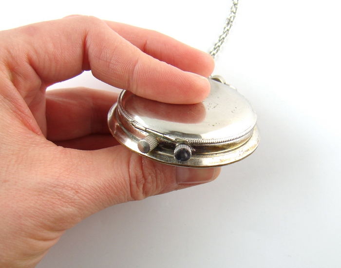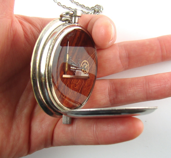 Ale, ale… za maleńkimi drzwiczkami kryje jeszcze coś. To miniatura maszyny parowej wykonana z drobiazgową troską o szczegóły wykończenia. Jest też miejsce, gdzie można wkleić zdjęcie – ten medalion może pełnić funkcję sekretnika.