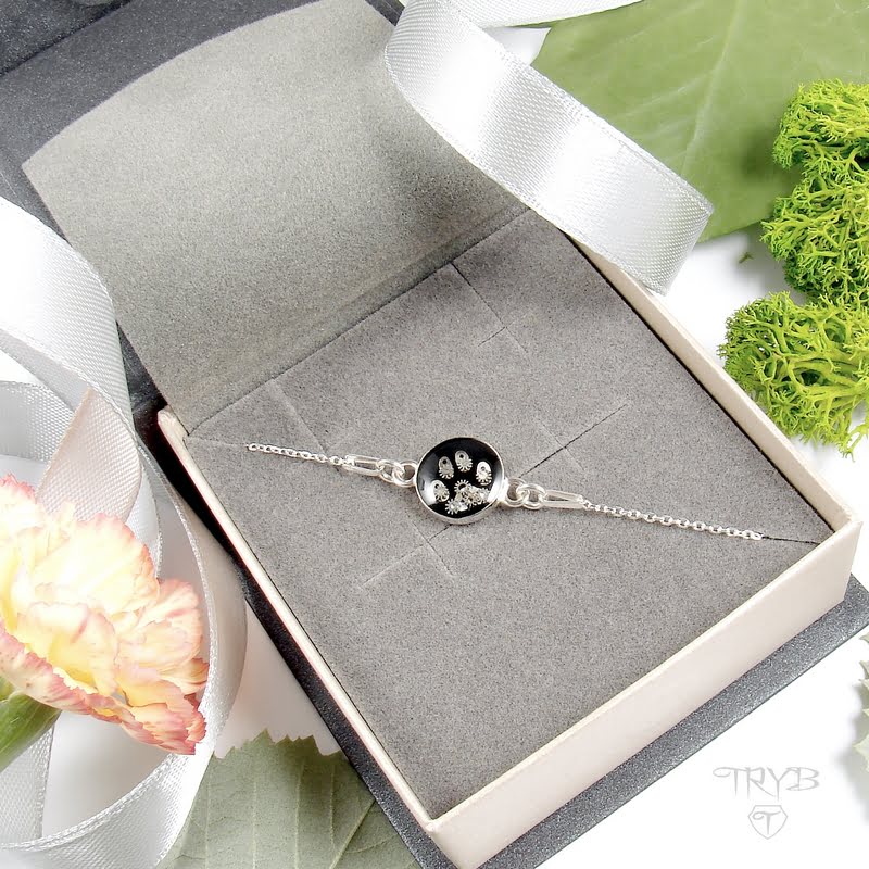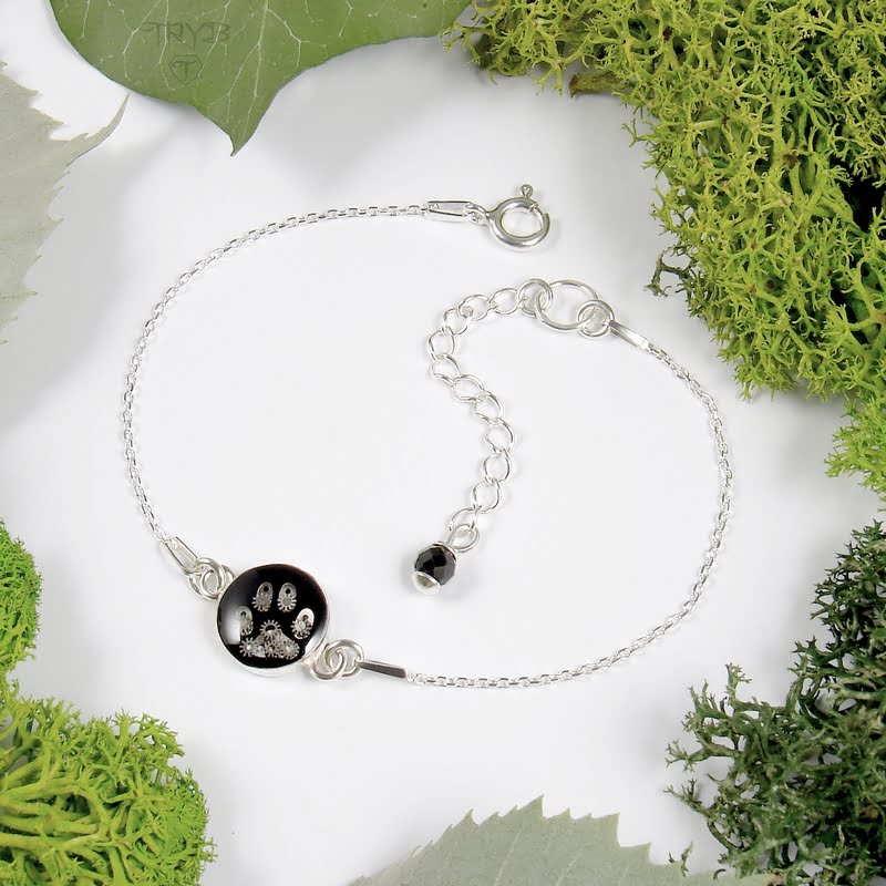 Czy wiesz, co pieski mają najbardziej uroczego? Na pewno wiesz! Łapki! Dlatego właśnie taki słodki ślad psich paluszków stał się inspiracją tej ozdoby damskiego nadgarstka. Psia łapka, którą widzisz w zawieszce tej subtelnej bransoletki na łańcuszku, jest zrobiona z różnych części pochodzących z mechanizmów starych zegarków. Wzór został utrwalony przejrzystą żywicą. Tło: w zawsze modnym czarnym kolorze. Oprawa zawieszki i łańcuszek tej bransoletki są wykonane ze srebra próby 925.