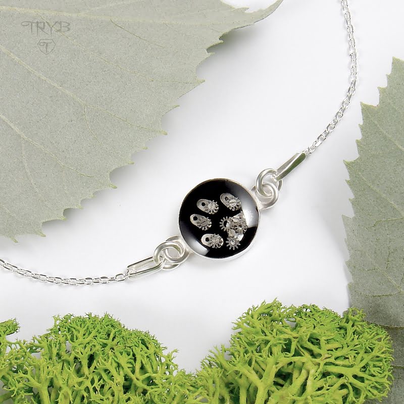 - ważniejsze materiały: srebro pr. 925 (oprawa bransoletki wraz z łańcuszkami i zapięciem), żywica, części zegarków (psia łapka), czarny, fasetowany spinel,
