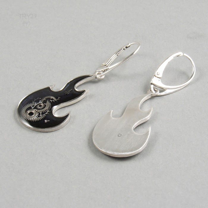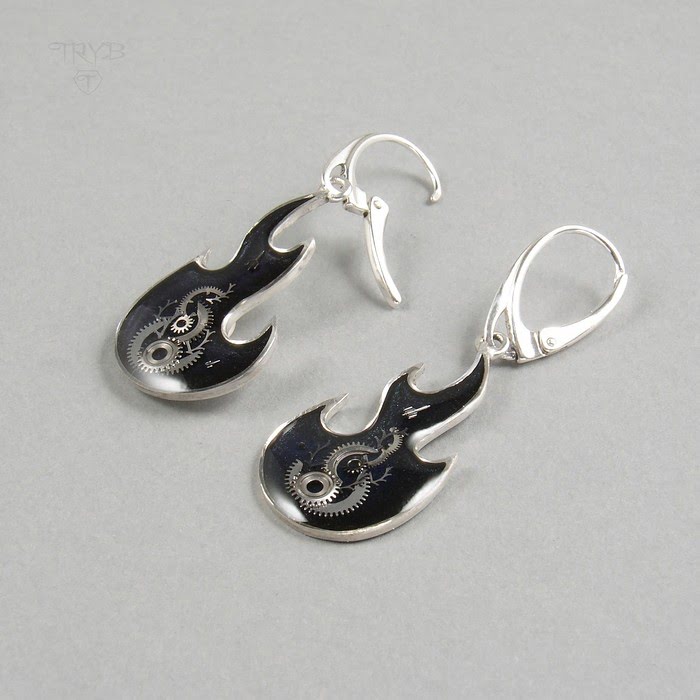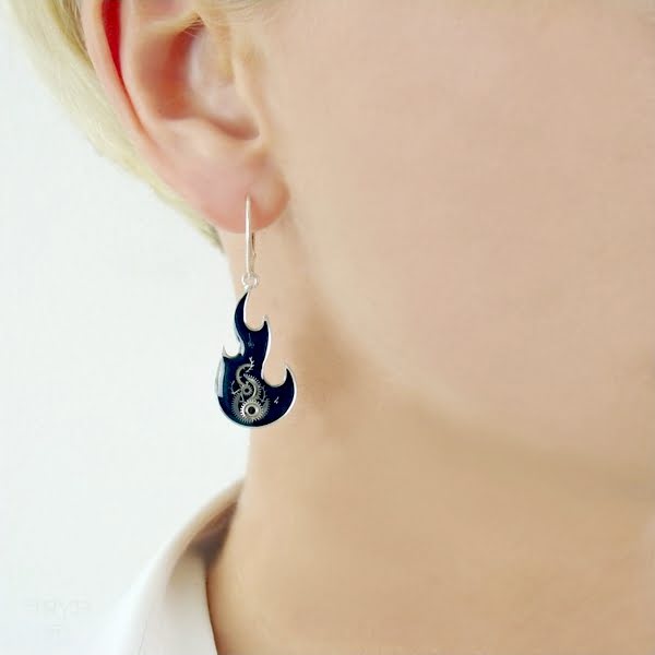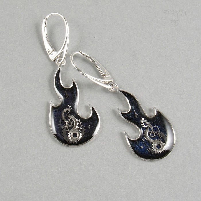 Ta niezwykła ręcznie wykonana para jest zrobiona ze srebra próby 925. Wewnątrz płomieni znajdują się kompozycje części zegarków utrwalone żywicą. Te stylowe kolczyki mogą też stanowić idealne uzupełnienie kreacji fanki ciężkiego grania.
