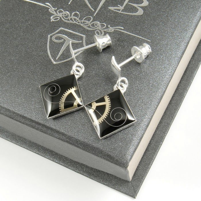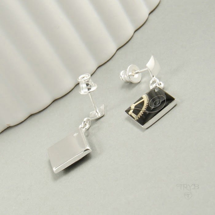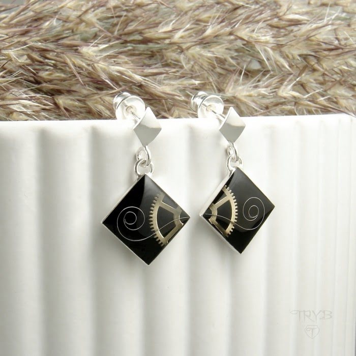 Te kolczyki są zrobione ręcznie. Ich oprawy, sztyfty a także zapięcia są ze srebra próby 925. Wewnątrz znajdują się metalowe części zegarków utrwalone w żywicy.