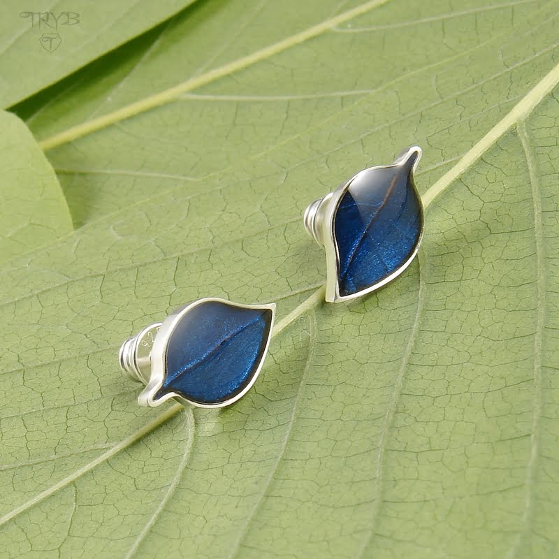 Ręcznie wykonane kolczyki wkrętki w kształcie niedużych listków. Oprawy są zrobione w tradycyjnych technikach złotniczych ze srebra wysokiej próby. Wewnątrz nich kryją się fragmenty prawdziwych, wybarwionych na granatowy kolor liści, które następnie zostały utrwalone przy pomocy żywicy. Zapięcia są również wykonane ze srebra i wyposażone w silikon w środku (ten typ zapięć jest zarówno ładny, jak i niezawodny).