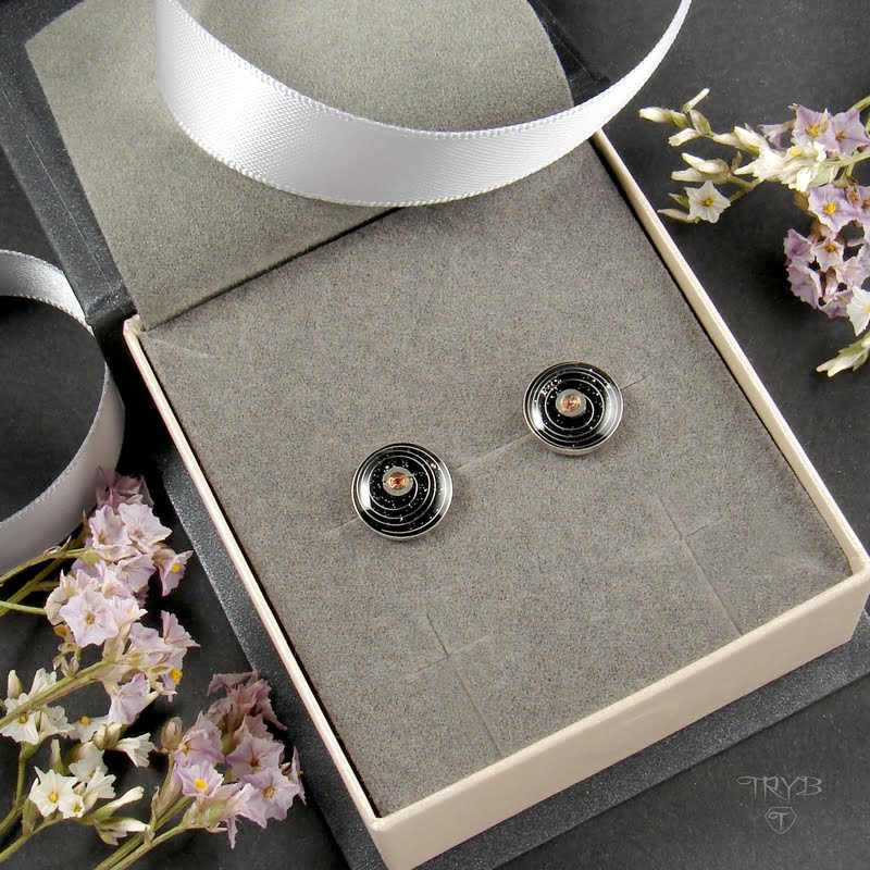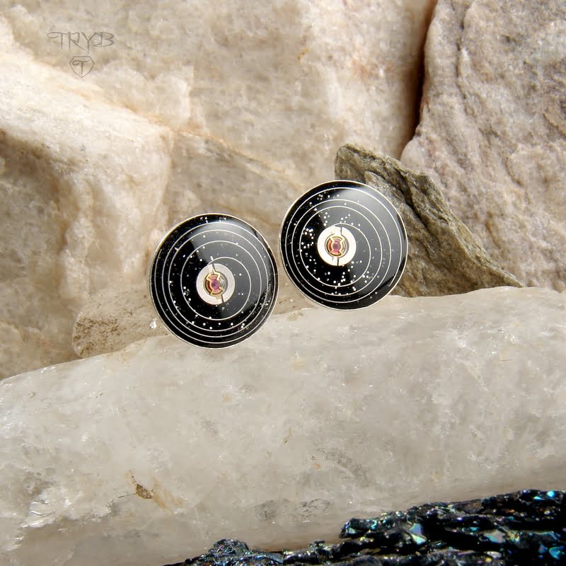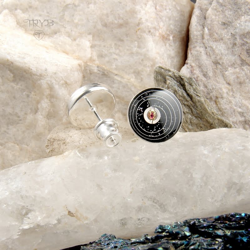 - najważniejsze materiały: srebro pr. 925 (oprawy kolczyków i zapięcia), żywica, części zegarków (kosmiczne kompozycje wewnątrz oczek)