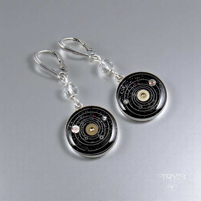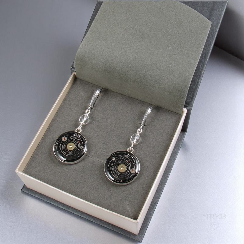 Astronomiczny motyw został zrobiony ręcznie z części starych zegarków a następnie zabezpieczony w przejrzystej żywicy jubilerskiej. Miniaturowe Układy Słoneczne zawierają następujące planety: Merkury, Wenus, Ziemia, Mars, Jowisz, Saturn, Uran, Neptun. Oprawiliśmy go w srebro wysokiej próby oraz ozdobiliśmy fasetowanymi kryształami górskimi.