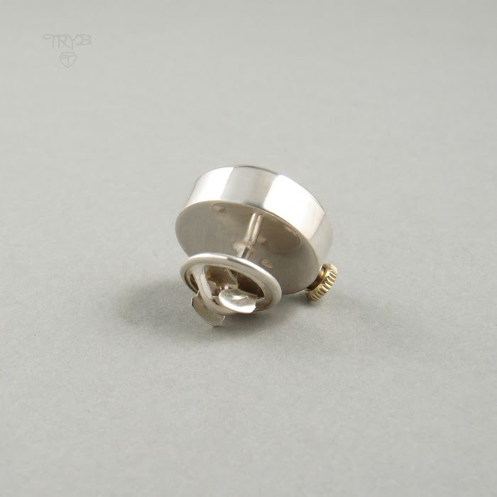 Z myślą o nich tworzymy na ogół różne mechaniczne spinki do mankietów, czy bransolety. Tym razem powstało coś innego: drobiazg, ale robiący przysłowiową kropkę nad „i” w eleganckim stroju. To srebrny pin do marynarki zaopatrzony w autentyczny, działający szwajcarski mechanizm. Ukazany pod szafirowym szkłem galwanizowany miedzią werk przyciąga wzrok swym energicznym ruchem koła balansowego. Tym bijącym sercem pina jest kaliber 2442 produkowany przez ETA (dodatkowe oznaczenie na mechanizmie „PA”) w latach ’60 ubiegłego wieku.