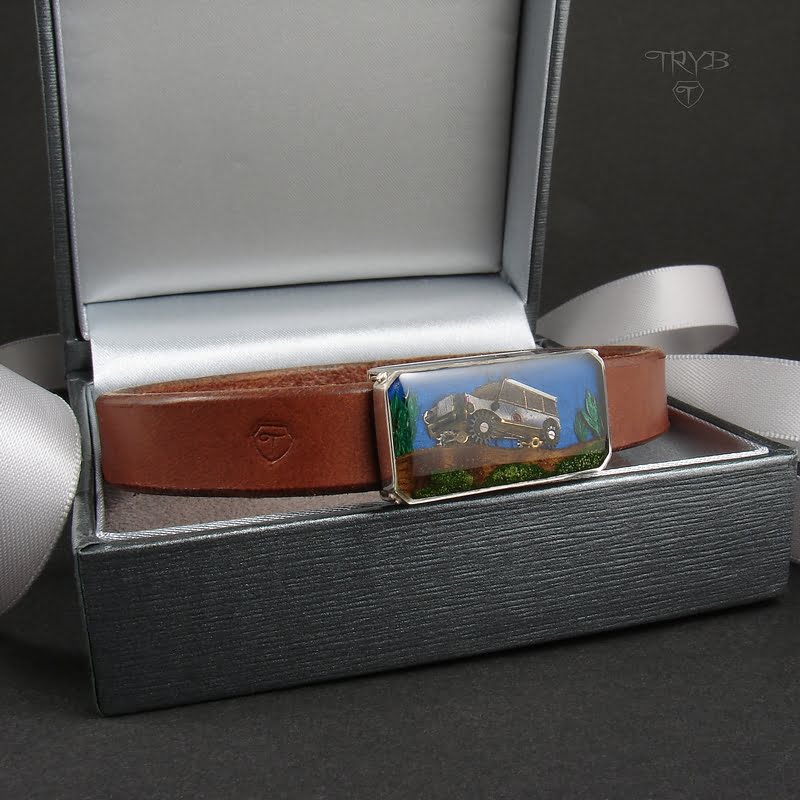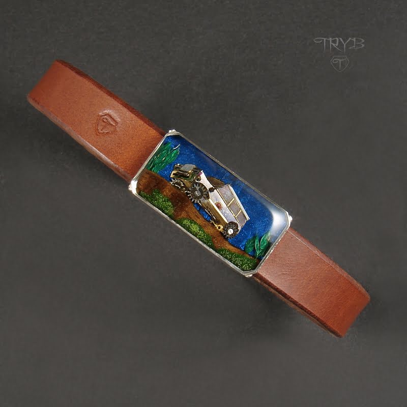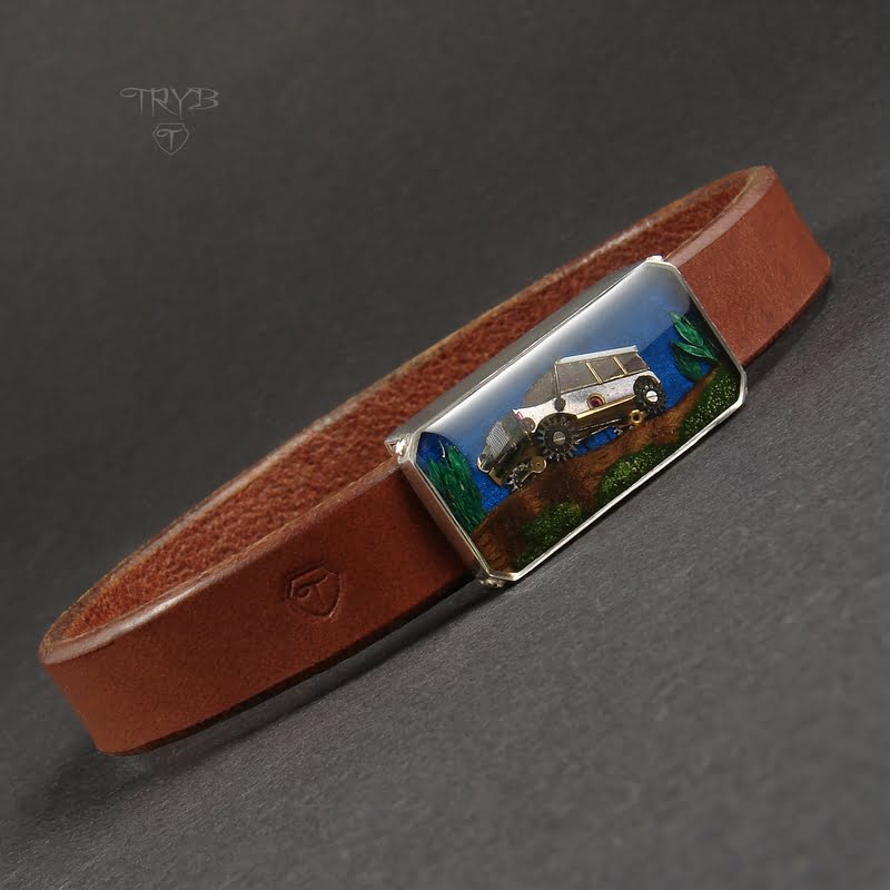 - Motyw samochodu terenowego zrobiony z części zegarków i utrwalony w żywicznym kaboszonie,