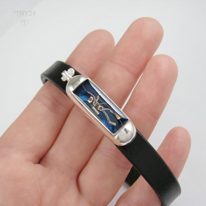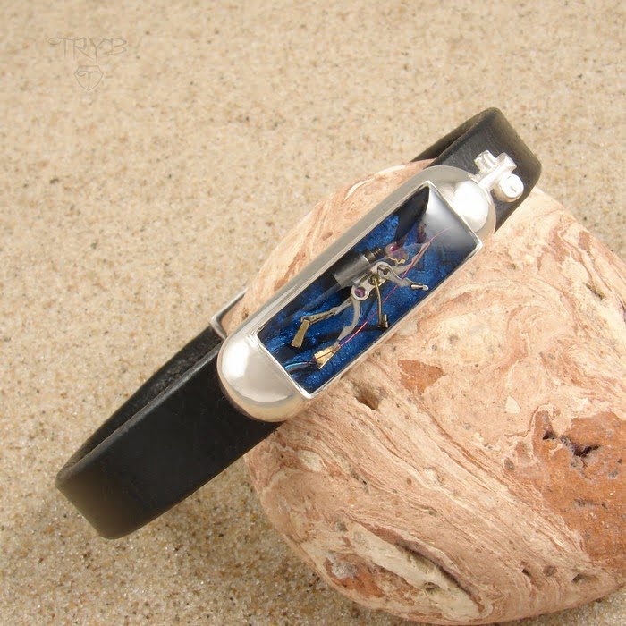 - materiały: skóra naturalna, srebro (butla i zapięcie), żywica (do utrwalenia miniatury wewnątrz butli), metalowe części zegarków (postać nurka), magnesy neodymowe (zapięcie)