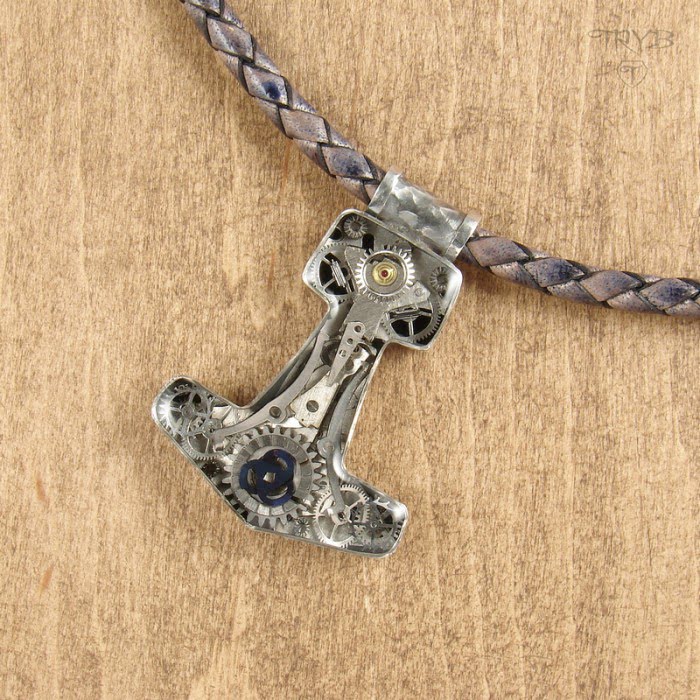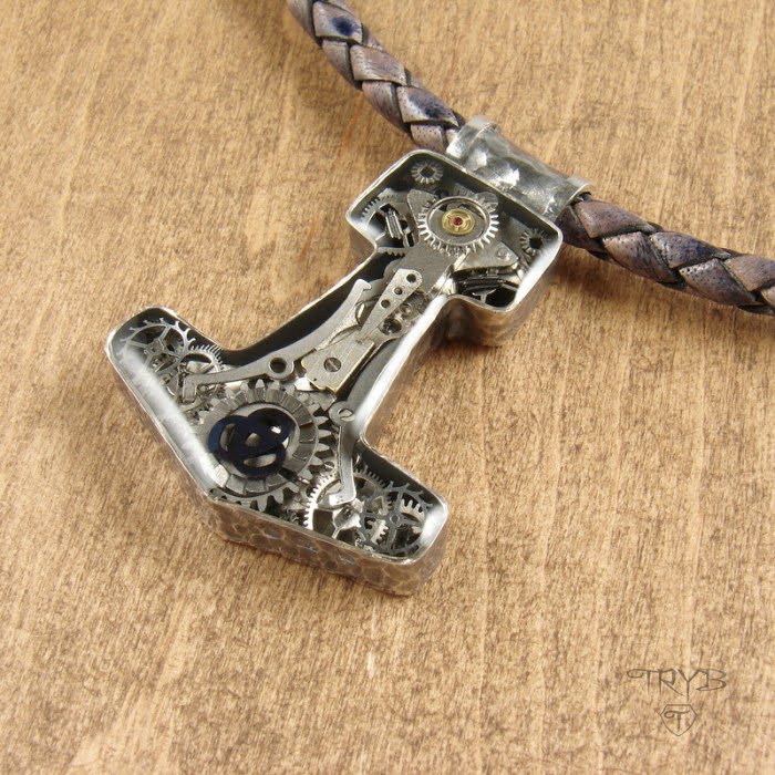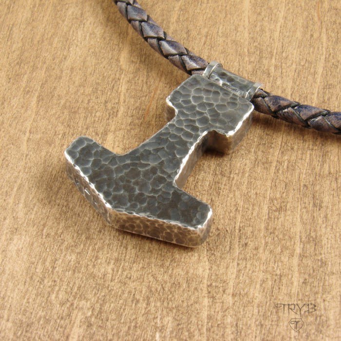 Mjølner czyli „ten, który miażdży” – w mitologii nordyckiej młot Thora był magiczną bronią i jednym z trzech atrybutów boga burzy i piorunów. Według Snorriego Sturlusona został wykuty przez karły o imionach Sindri i Brokk. Ten prezentowany tutaj symbol odwagi, siły i inwencji został zrobiony przeze mnie. Choć karłem nie jestem, to pracuję również własnoręcznie posługując się tradycyjnymi technikami złotniczymi, ale bez użycia magii (no może odrobinę, ale o tym za chwilę)