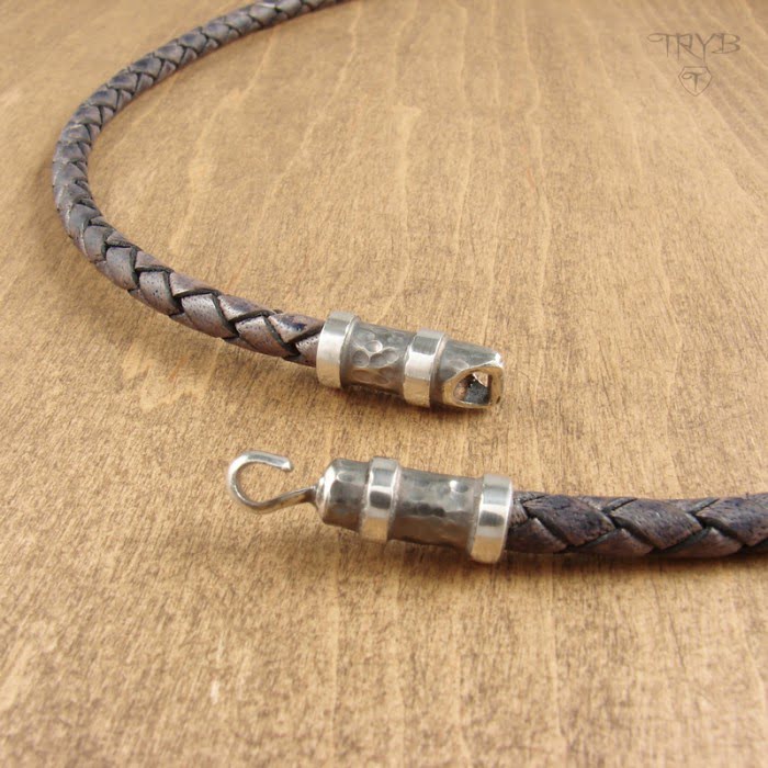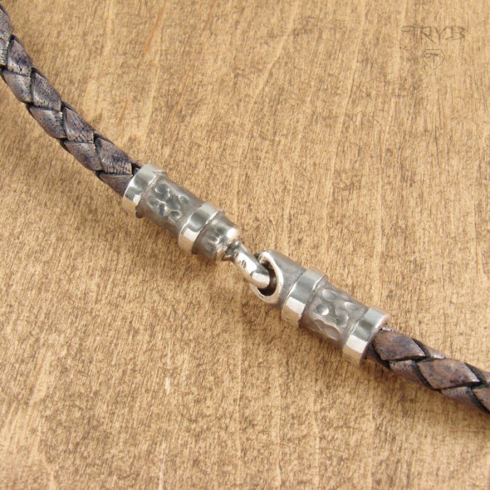 Srebrna powierzchnia oprawy tej surowej zawieszki otrzymała młotkowaną fakturę, która następnie została przyciemniona oksydą i miejscami wypolerowana. Podobnie wyglądało przygotowanie odpowiedniego, srebrnego zapięcia dla plecionego rzemienia z barwionej skóry naturalnej. Hak jest dobrze przemyślanym zapięciem i trzyma solidnie, ponieważ aby go rozpiąć, trzeba ustawić obie części pod kątem 90 stopni względem siebie, co uniemożliwia przypadkowe zgubienie ozdoby.