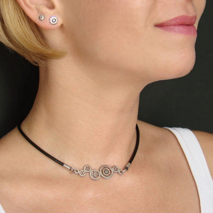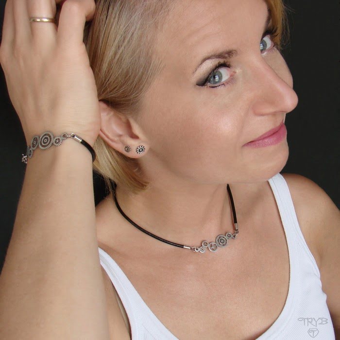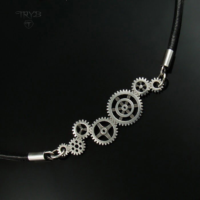 Ten srebrny naszyjnik z zębatkami został wykonany ze szlachetnego kruszcu wysokiej próby oraz skórzanego rzemienia. Elementy zrobione ze srebra wykończyliśmy poprzez zaoksydowanie i wypolerowanie, dzięki czemu są miejscowo przyciemnione, choć ich główna powierzchnia dekoracyjna jest jasna i błyszcząca.