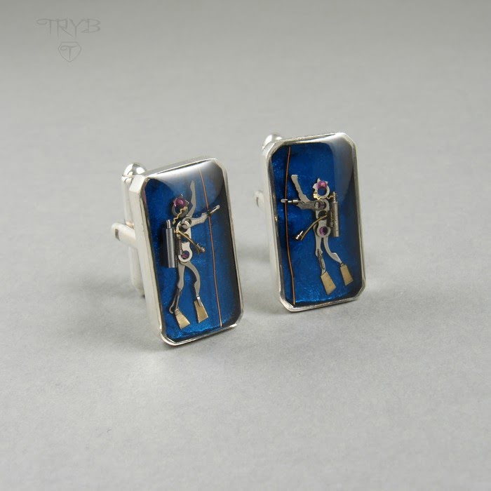 - główne materiały: srebro pr. 925 (oprawy spinek), żywica, części zegarków (postacie nurków),