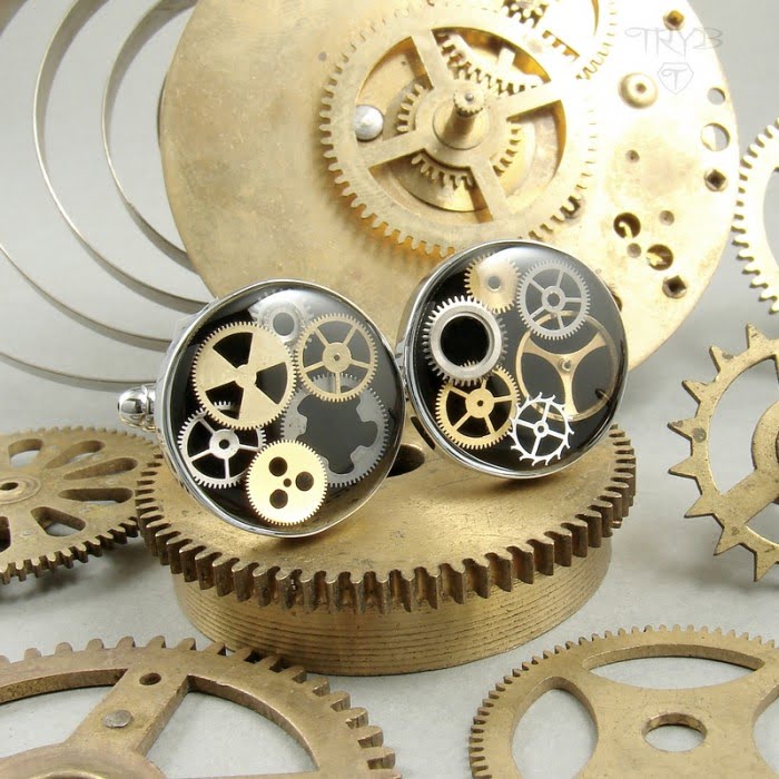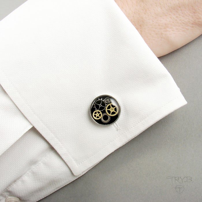 Oryginalne, ręcznie robione spinki do mankietów z mechanicznym z zębatkami. W okrągłych oczkach tej pary znajduje się trójwymiarowa kompozycja prawdziwych zegarkowych trybików zawieszonych w krystalicznej żywicy jubilerskiej na tle w klasycznie czarnym kolorze. Oprawy zostały wykonane są z chromowanego mosiądzu oraz wykończone na wysoki połysk. Są bardzo ładne, trwałe i eleganckie. Dla wielu panów sporym atutem będzie to, iż wykończenie chromowane nie ciemnieje.
