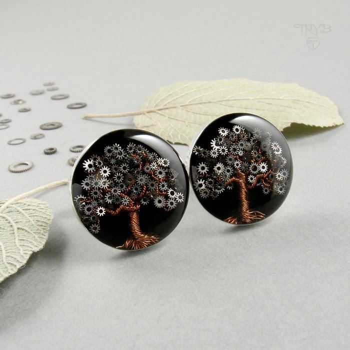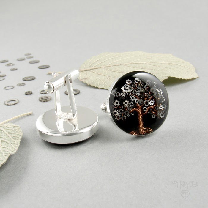 Ręcznie robione, nietuzinkowe mankietówki. Klasycznie okrągłe, o stonowanej kolorystyce. Ich główną ozdobą są malutkie drzewa na czarnym tle. Materiał, z którego wykonaliśmy te dendrologiczne miniaturki jest dość oryginalny: korony są zrobione z metalowych zegarkowych trybików, zaś pnie z cieniutkiego miedzianego drucika nawojowego. Następnie te delikatne motywy zabezpieczyliśmy przejrzystą żywicą, tworząc w ten sposób dekoracyjne kaboszony, które zdobią oczka tej męskiej biżuterii.