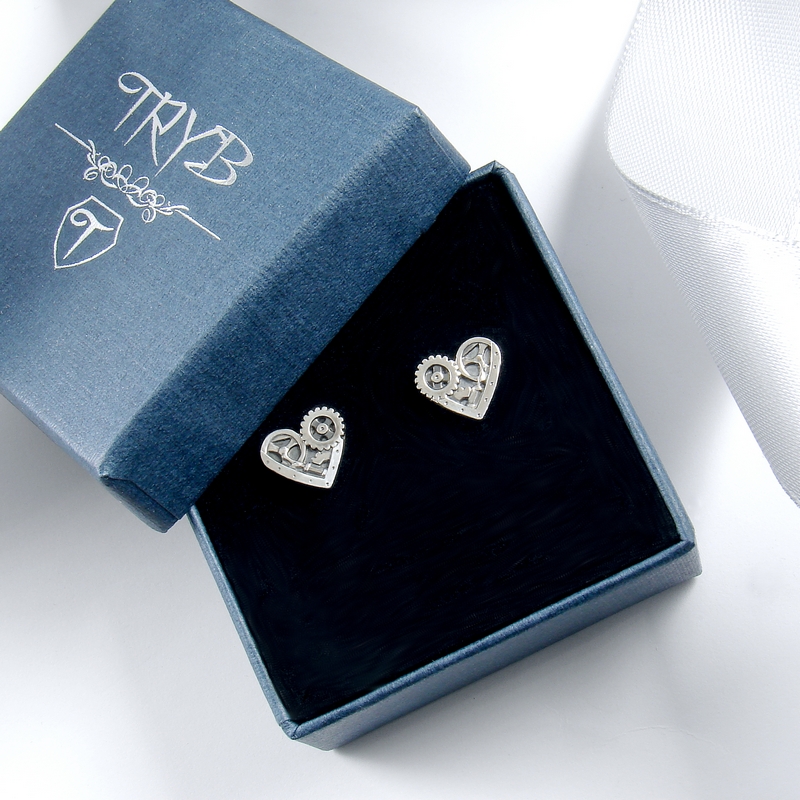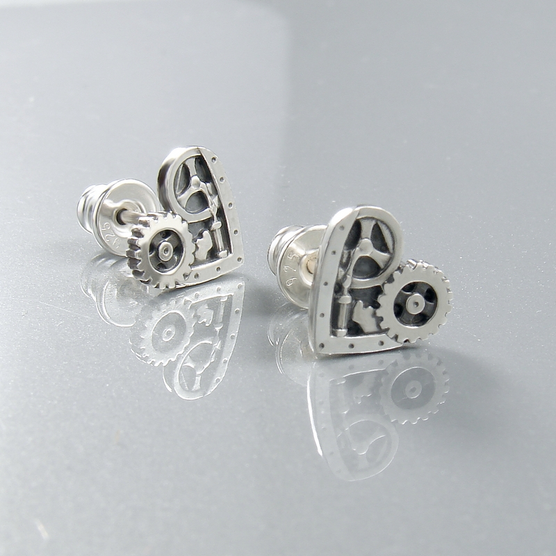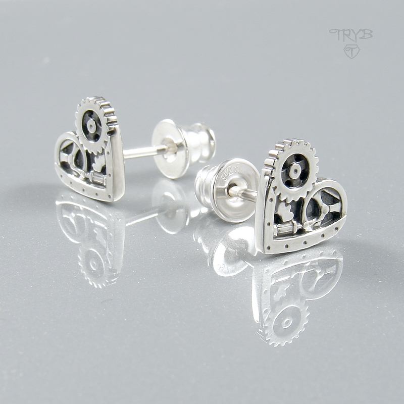 Te wyraziste kolczyki serca są zrobione w całości ze srebra 925. Ich powierzchnię zdobi mechaniczny motyw inspirowany maszynami wieku pary i elektryczności, kiedy wszelkie maszyny były wywarzane z sercem i nawet żelazka miały duszę 😉
