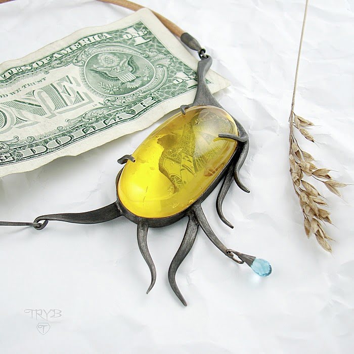 - materiały: srebro oksydowane, naturalny bursztyn bałtycki, banknot, naturalny topaz Swiss, rzemień skórzany,