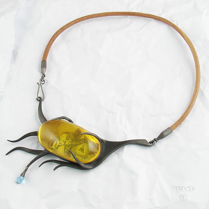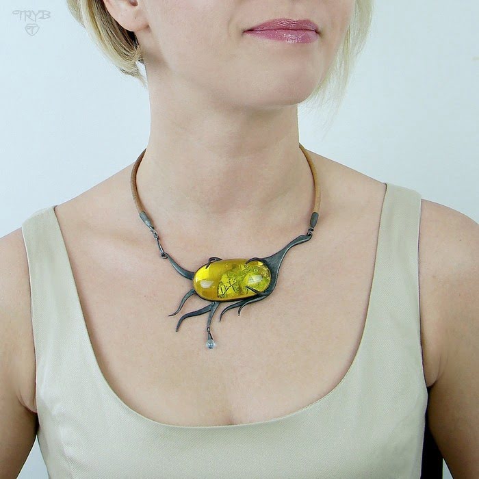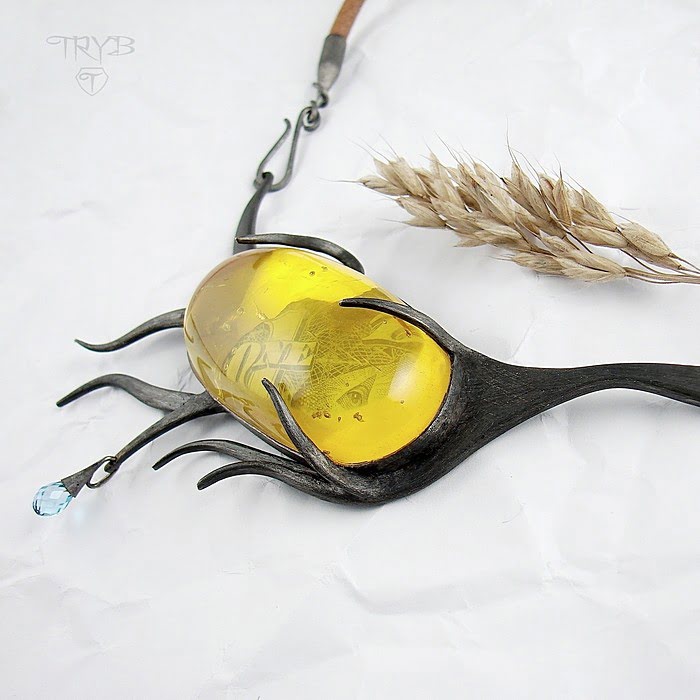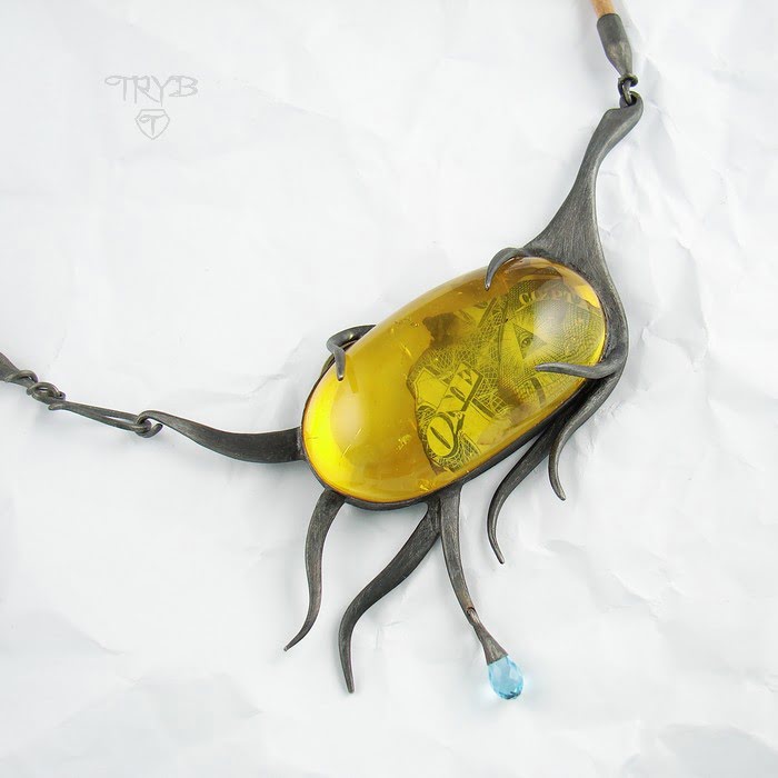 Bursztyn powstaje przez miliony lat – wykorzystaliśmy ten fakt tworząc nietypowy naszyjnik, jaki według nas mógłby zostać wykonany w odległej przyszłości, przez przedstawiciela nowej, wschodzącej cywilizacji post-homo-sapiens. Wybiegając wyobraźnią w przyszłość wybraliśmy materiały naturalne: bursztyn, srebro, topaz, skórę. Następnie nadaliśmy naszyjnikowi kształt stylizowany na organiczną formę nawiązującą zarówno do świata flory (skojarzenie z gałęziami), jak i fauny (podobieństwo do macek ośmiornicy). Mimo to położyliśmy też nacisk na pewną delikatność kształtu, elegancką naturalność. Tak, by pomimo okazałych rozmiarów i organicznego wyglądu ten srebrny naszyjnik był naprawdę niezwykły, lekki optycznie i po prostu piękny.