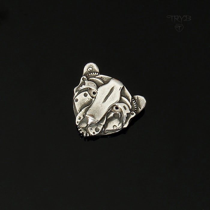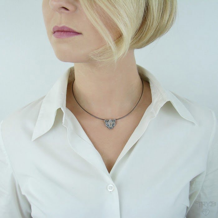 Wisiorek w kształcie głowy dzikiego kota o charakterystycznym bio-mechanicznym charakterze. Inspirowany stylistyką steampunk. Portret zwierzęcia na podstawie autorskiego projektu przy wykorzystaniu tradycyjnych technik złotniczych. Wykonany w całości ze srebra, zaoksydowany na ciemno i wypolerowany miejscowo w celu wydobycia detali motywu.
