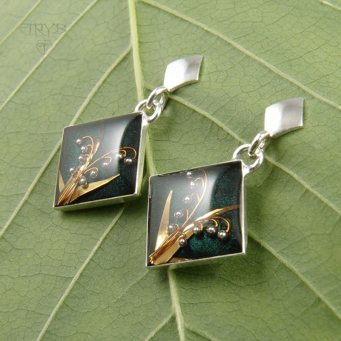 - materiały: srebro próby 925 (oprawy, sztyfty, zapięcia), miedziany drucik, wskazówki zegarków, szklane perełki (miniaturowe konwalie), żywica,