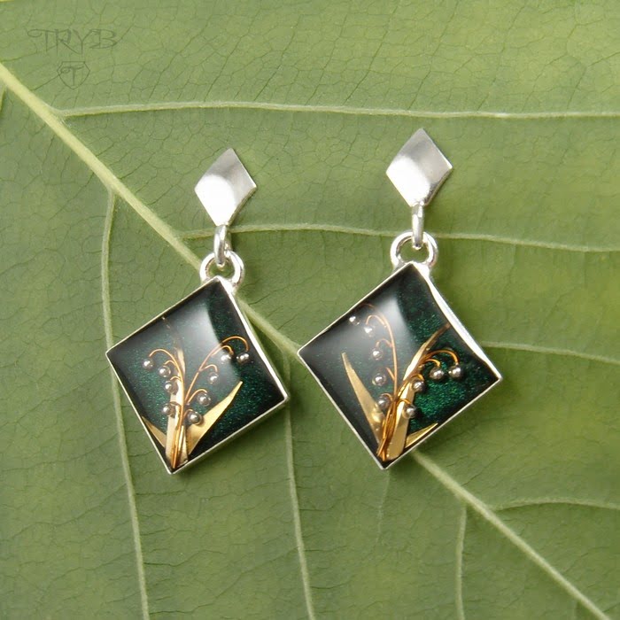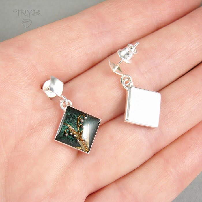 Te zielone kolczyki z konwaliami są zrobione ręcznie. Ich oprawy, sztyfty a także zapięcia są ze srebra próby 925. Z kolei wewnątrz kwadratów na szmaragdowozielonym tle prezentują się miniaturowe konwalie zrobione z miedzianego drutu, wskazówek pochodzących z zegarków naręcznych oraz maciupkich szklanych perełek. Zostały one zabezpieczone i wykończone przejrzystą żywicą.
