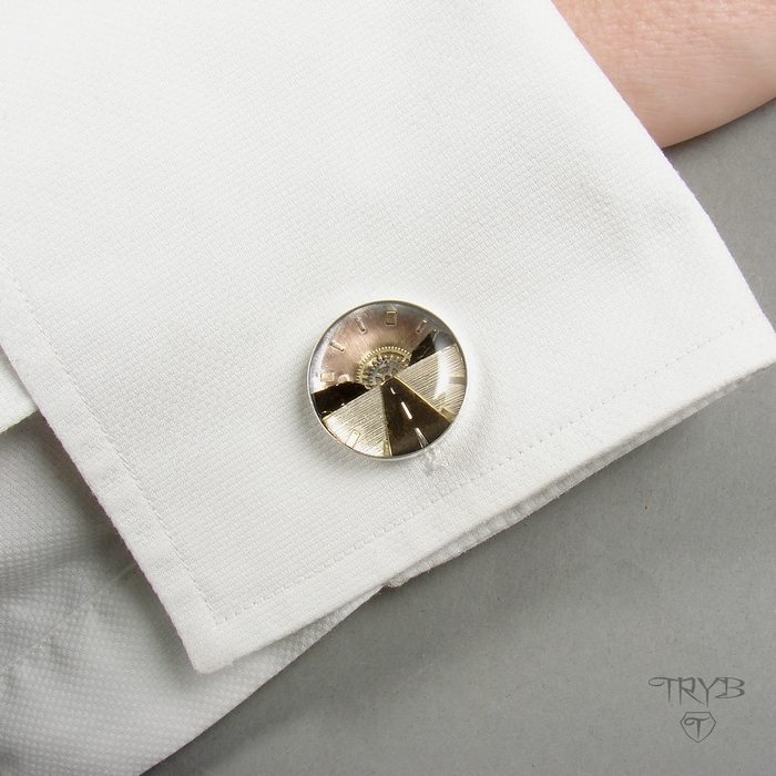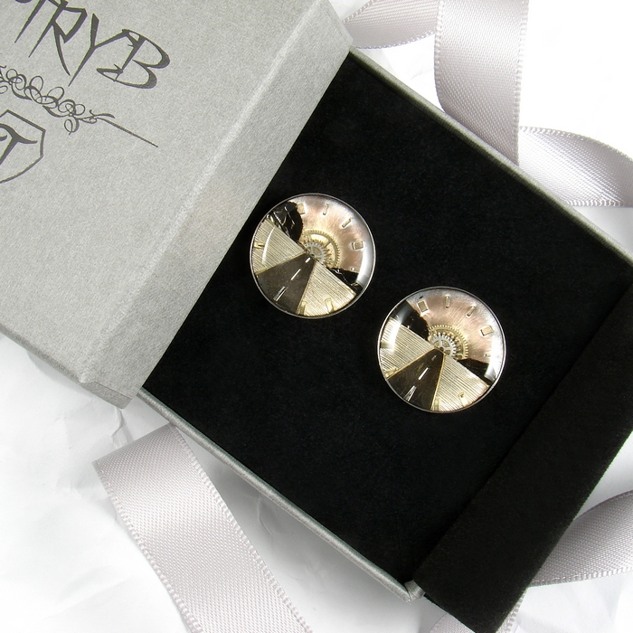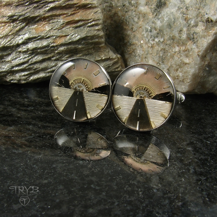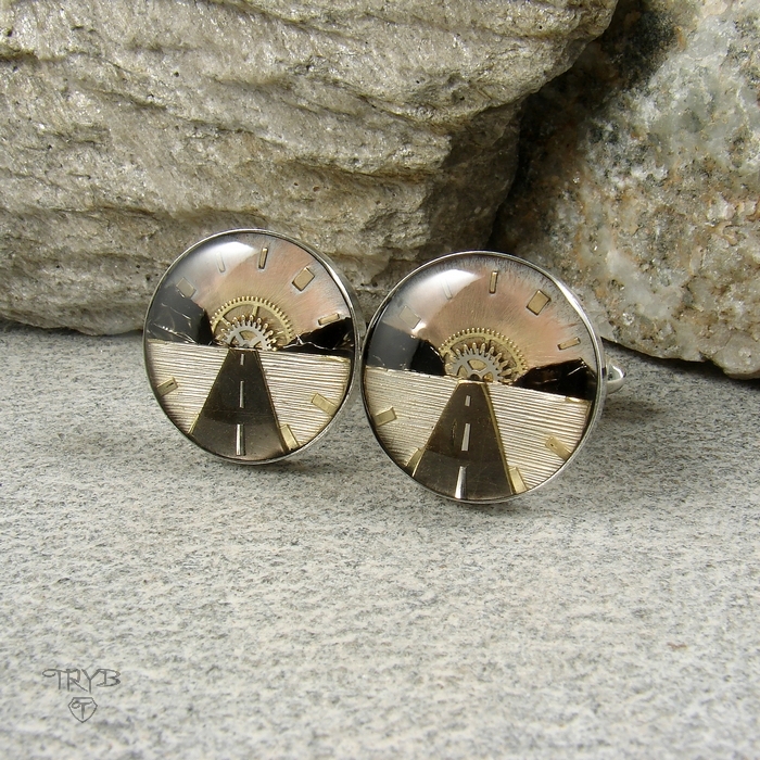 Te niebanalne i eleganckie spinki do mankietów są dla tych, którzy ciągle są w drodze, którzy kochają podróże, dla których celem w życiu jest horyzont. Idealnie sprawdzą się też jako prezent dla fana motoryzacji i/lub kultowych filmów drogi. To męska biżuteria, której nie powstydzi się żaden facet. Ręcznie wykonana z części zegarków kompozycja przedstawia rozległą równinę przeciętą ciemną taśmą szosy, znikającą na horyzoncie między wzniesieniami w zachodzącym Słońcu. Wszystko to jest zawarte w srebrnym oczku o średnicy 18mm.