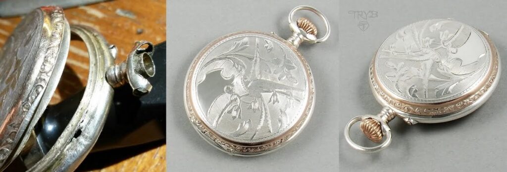 Z kolei oprawa tej ręcznie robionej zawieszki to ponad stuletnia koperta zegarka kieszonkowego, poddana gruntownej naprawie, renowacji i odświeżeniu w naszej pracowni, a wybrana do tej realizacji ze względu na pełną wdzięku jaskółkę wygrawerowaną na odwrocie. Jak widać na zdjęciach poniżej, ukazujących ją przed i po renowacji, była w opłakanym stanie. Zamiast jednak ją przetopić, uznaliśmy, iż postaramy się ją uratować, naprawić ubytki i doprowadzić do ładnego stanu. Szkoda by było skazać na niebyt taki piękny przedmiot 🙂 Naprawy takich zabytków zawsze są ryzykowne, ale się udało!