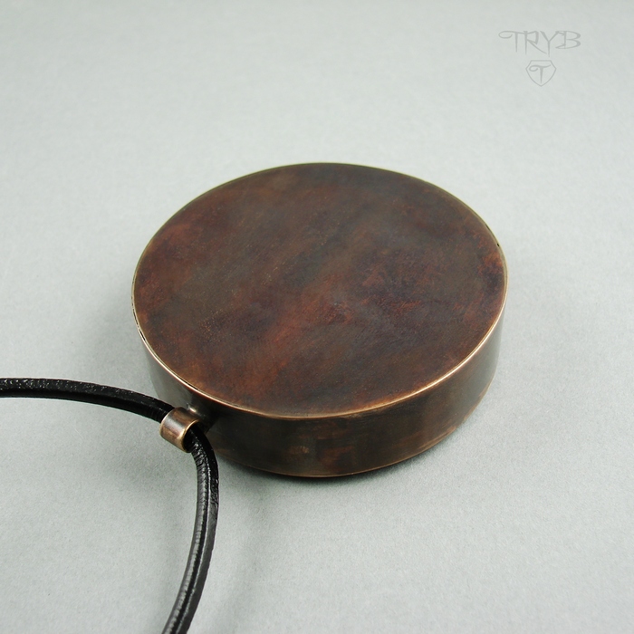 Tak, jest duży, masywny i ciężki, ale ileż się dzieje w środku! Ze względu na gabaryty i masę zdecydowaliśmy się nadać mu również drugą funkcję – obrazka do powieszenia na ścianie. Dlatego wykonaliśmy dla niego ramę. W przygotowany w ramie otwór można wisior włożyć i powiesić na ścianie jako ozdobę domu. Można go też z tej ramy wyjąć i nosić na szyi jako okazały medalion.